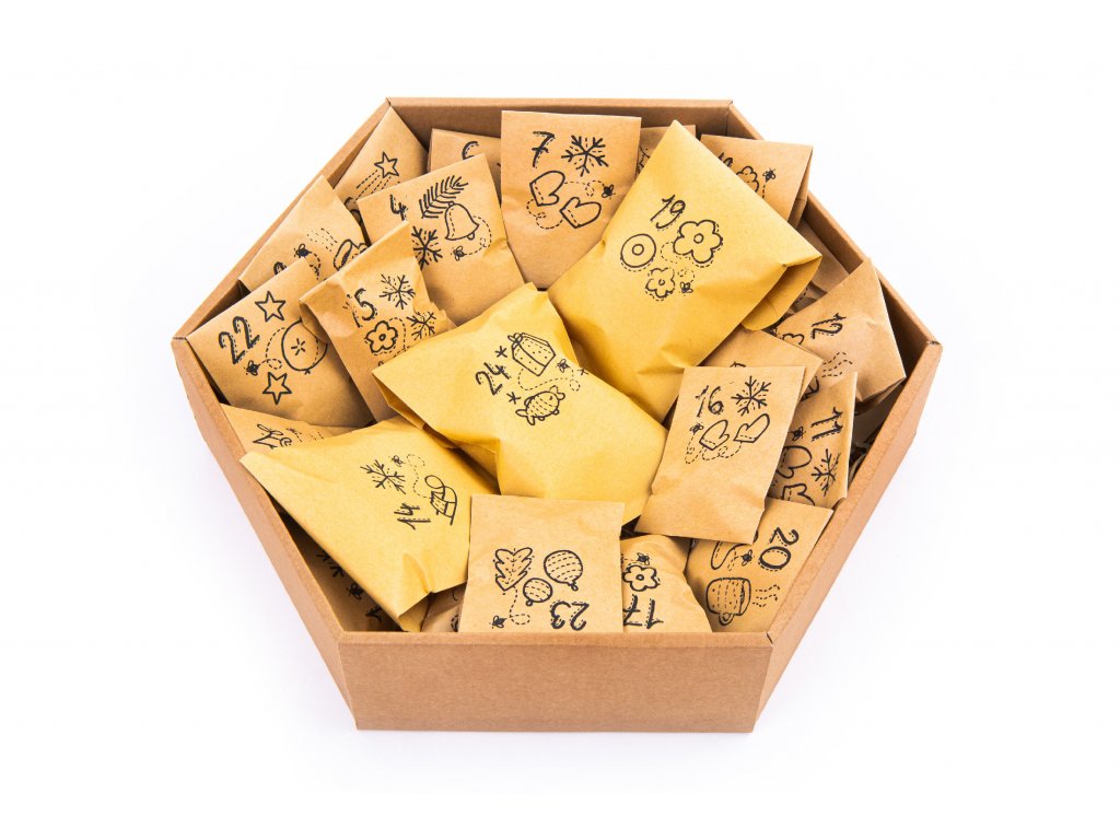 U našeho adventního kalendáře jsme dbali na ekologii, jak u obsahu, tak u obalu. Krabička je z papírového kartonu. Papírové pytlíčky z recyklované papíru a jednotlivé vonné vosky jsou zabalené do znovupoužitelných voskovaných plátýnek.